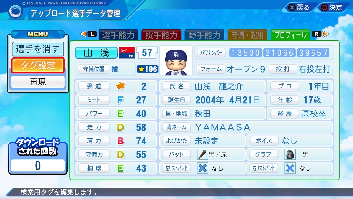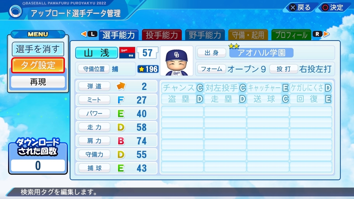 守備力D 強肩だけでなく、捕ってから投げるのが速い。プロでも売りに出来る部分かと