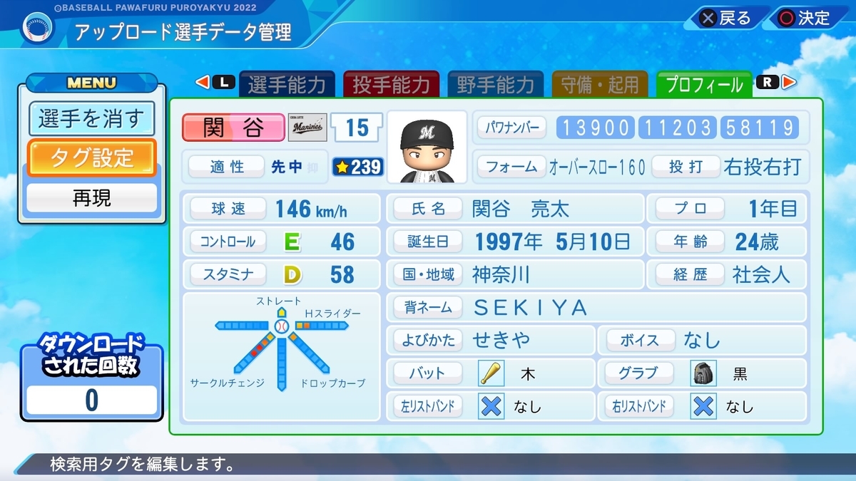 パワプロでも固有フォームになっている投球フォームがかっこよくて好きです。映像で見たところフィールディングがかなり良かったので、守備力はデフォルトより高めに。「チェンジアップは劇薬」という権藤理論が該当する投手かもしれません。