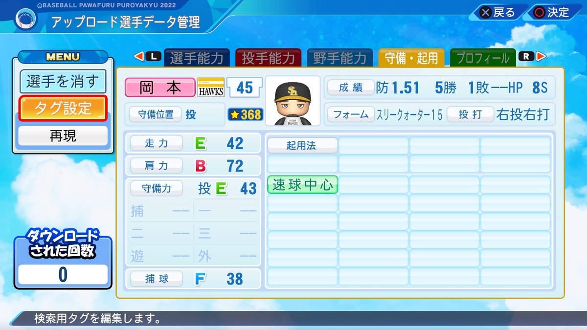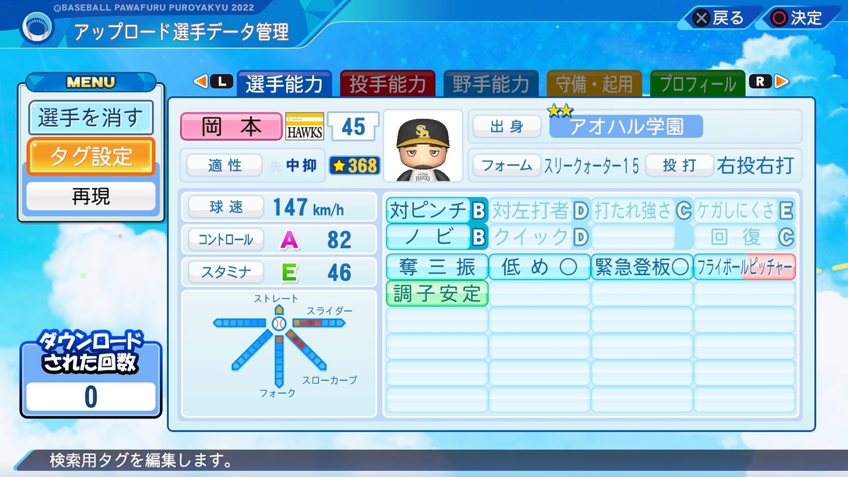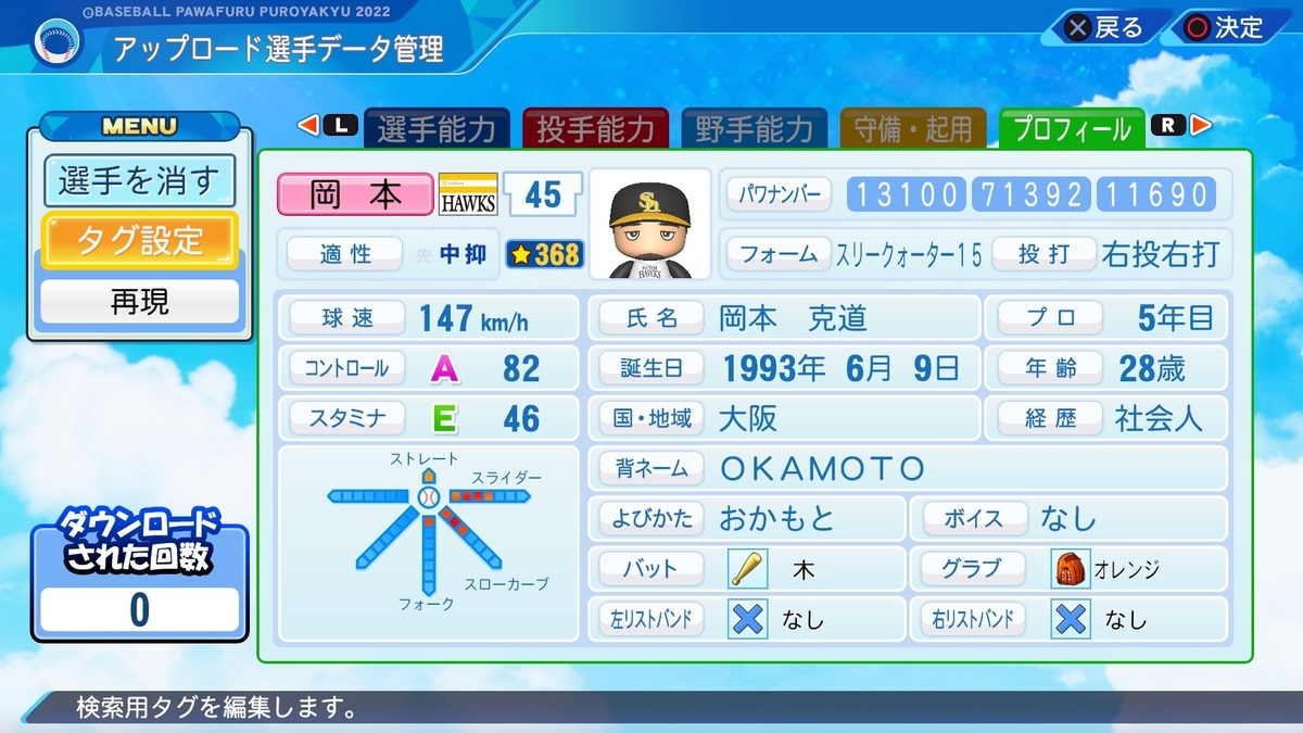 晃、真也、そしてこの克道と00年代前半にセットアッパーを務めた3人の「岡本」を作成しました。それぞれ特徴があり面白くなっていると思います。出身地が兵庫、京都、大阪となっているように、「岡本」は関西に多い姓のようです。