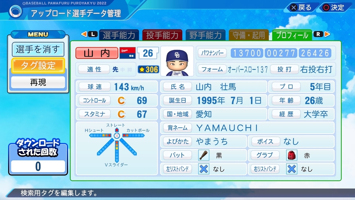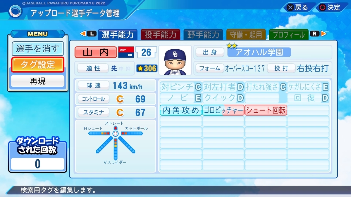 ゴロピッチャーをつけたいということもあり作成。Hシュートにするか、シンキングツーシームにするか非常に悩みました。今回は「シュート」の響きを優先しました。