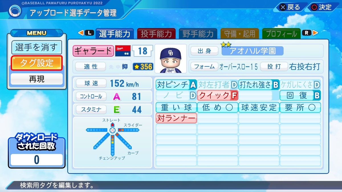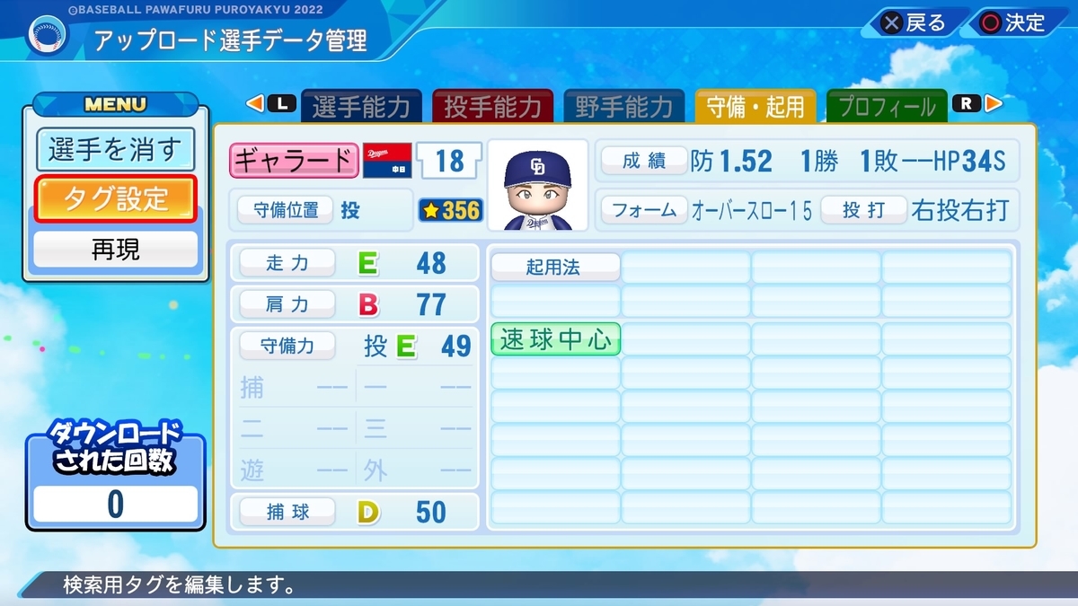 クイック時の投球を含めてクイックに難があった印象。抑えに固執したエピソードから中継ぎ適正は付けませんでした。拘りが強く、バンチとは不仲だったなど難もありましたが、ドラゴンズ史に残る名助っ人だと思います。